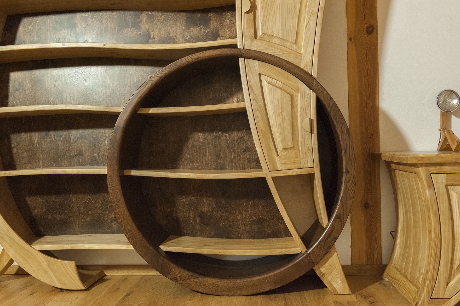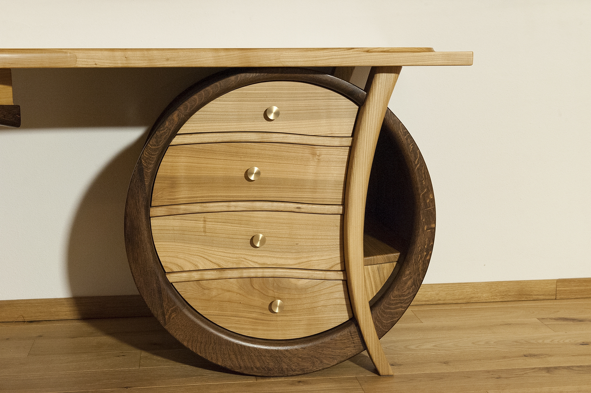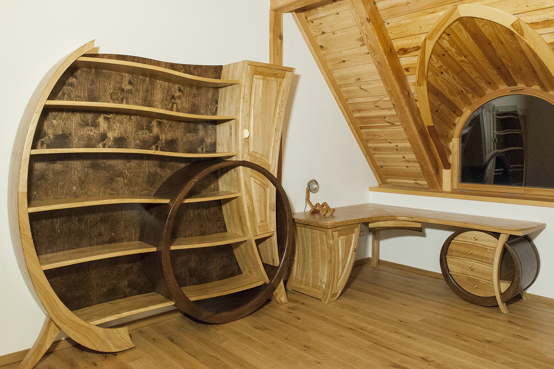 Prezentuję drewniane meble gabinetowe, biurko i regał. Meble do gabinetu zaprojektowałem i wykonałem na indywidualne zamówienie, na wymiar. Meble wykonałem z drewna czereśni a elementy ciemne z barwionego dębu. Meble drewniane do domowego gabinetu, kształtem nawiązują do elementów architektonicznych budynku, poddasza na którym znajduje się gabinet. Drewniany regał z otwartymi półkami i klinowatą zamykaną szafką z półkami, wykonaną z drewna czereśni, całość wiąże dębowy, cylindryczny element. Narożne biurko w całości wykonane z litego drewna czereśni, po lewej zamykana szafka w kształcie klina, po prawej dębowy, cylindryczny, element w którym znajdują się w pełni użytkowe szuflady na drewnianych prowadnicach. Meble dla ceniących naturalne drewno, jego piękno i właściwości oraz unikatowe kształty mebli.
